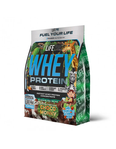 Whey Choco Monky es una proteína concentrada innovadora desarrollada por Life Pro. Disfruta del nuevo y delicioso sabor a tableta de chocolate Monky, evocando la nostalgia de tu infancia. Elaborada con suero de leche Lacprodan SP-Instant, esta proteína garantiza una alta calidad y pureza.
