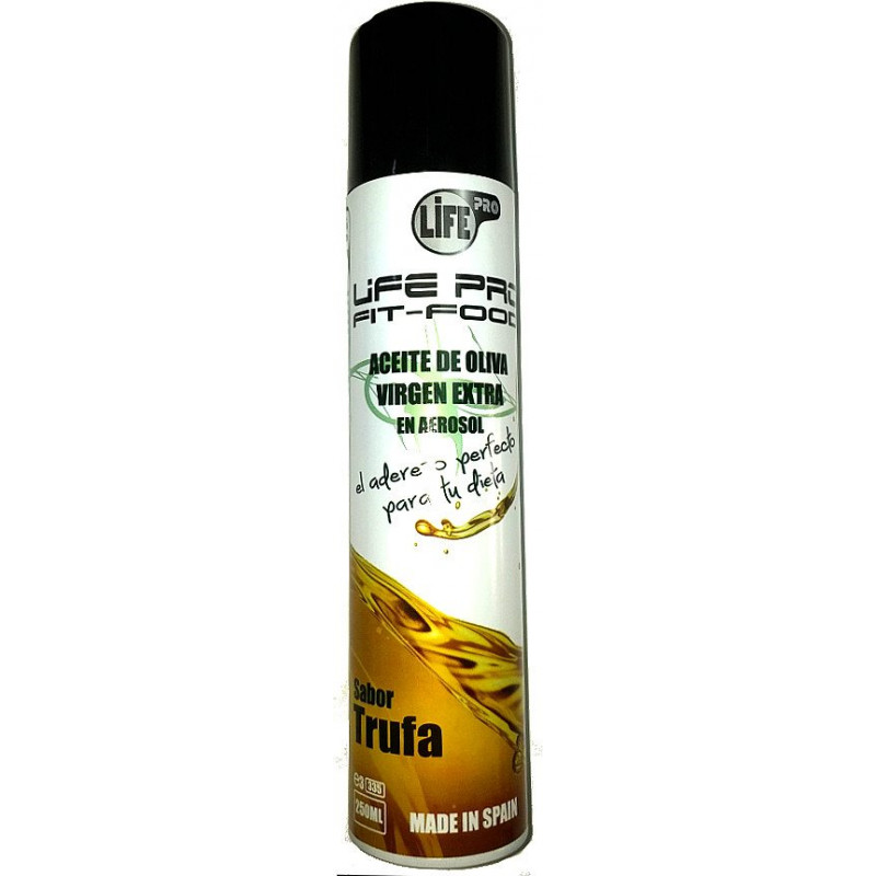 LIFE PRO FIT-FOOD sabor a trufa viene en un cómo envase en aerosol que evita malgastar ni una sóla gota de aceite y una aplicación limpia y precisa.