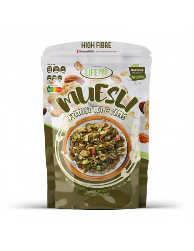 Life Pro Fitfood Muesli 300g es una fusión de ingredientes de alta calidad, seleccionados para proporcionarte un sabor delicioso y un valor nutricional excepcional. La variante Honey & Seeds combina la dulzura natural de la miel con la textura crujiente de una variedad de semillas, mientras que la variante Matcha Tea & Seeds incorpora el distintivo sabor del matcha con una mezcla equilibrada de semillas nutritivas.
