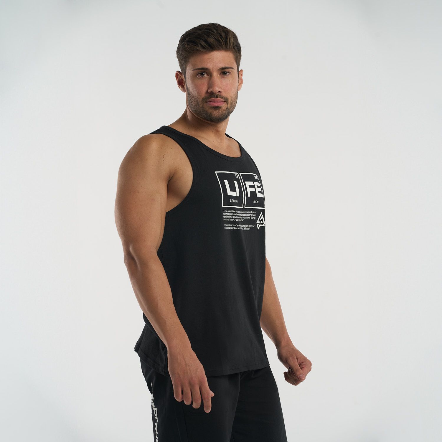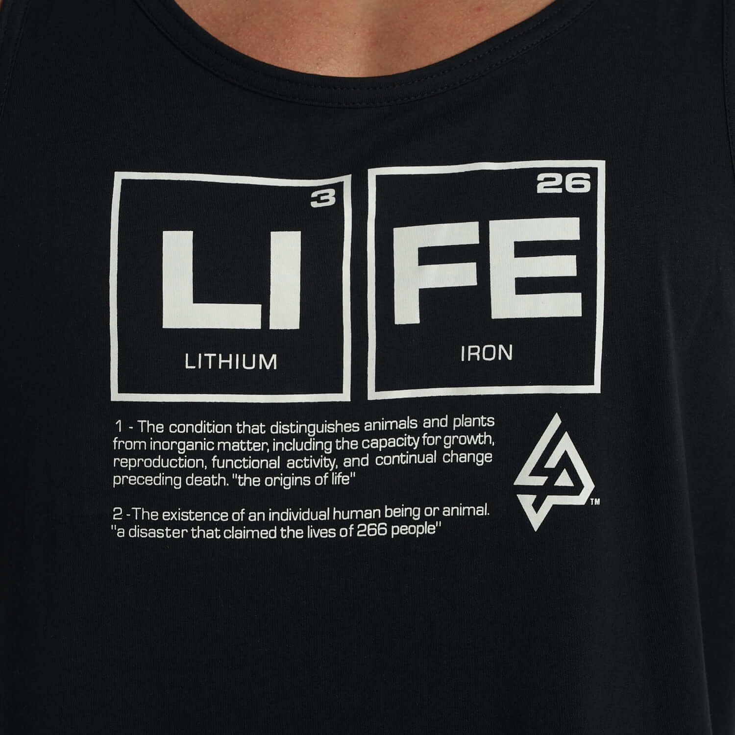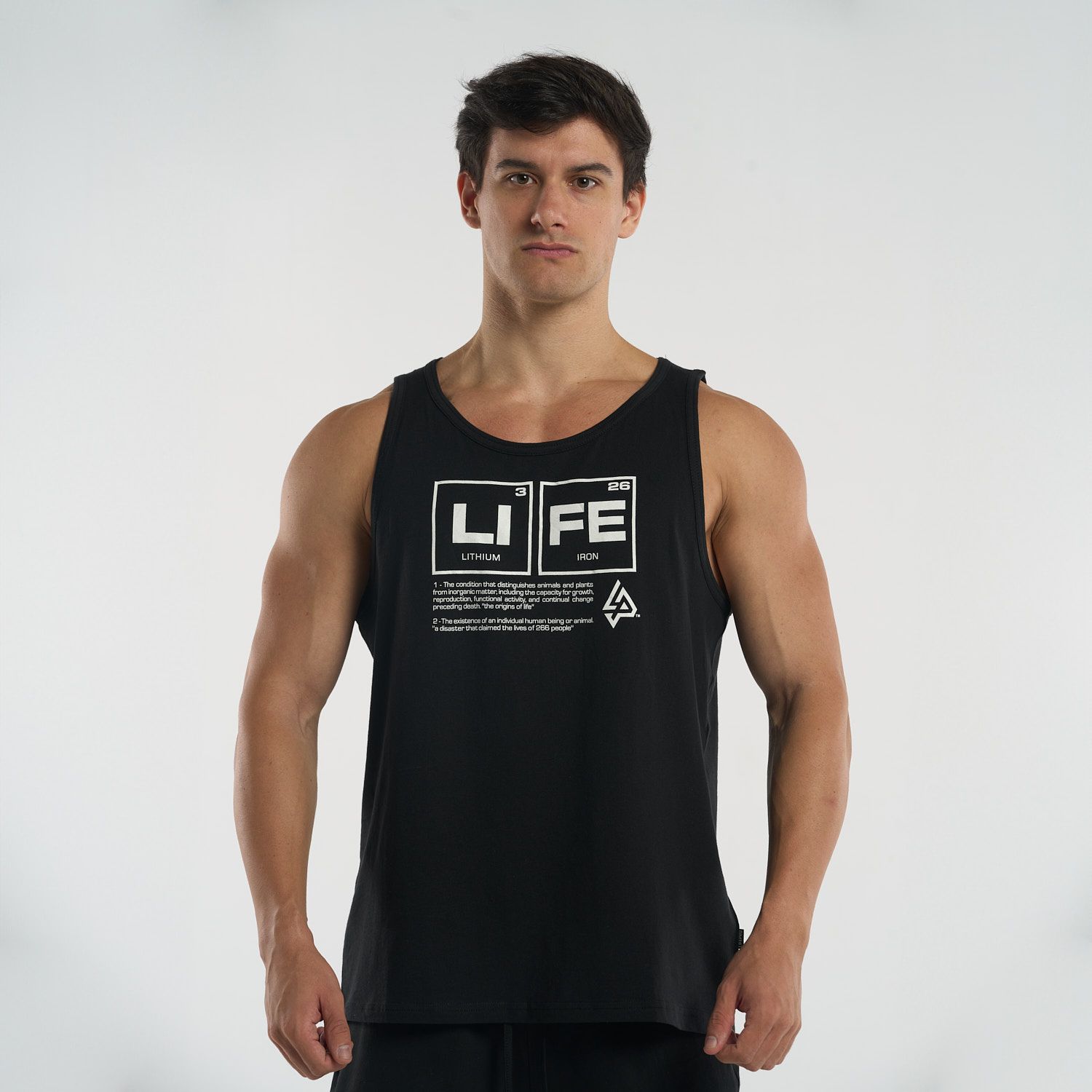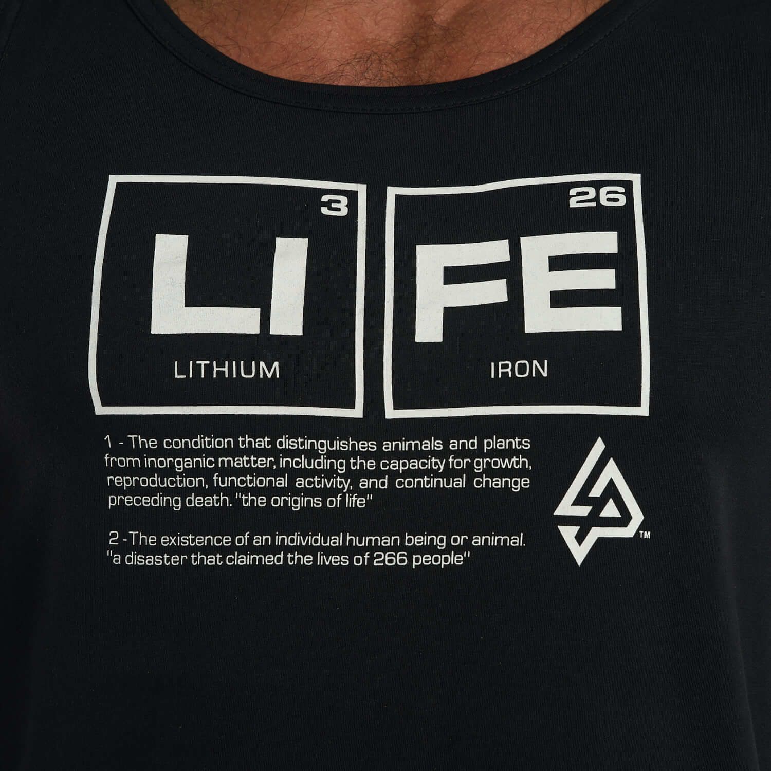 Diseñada para brindar comodidad sin restricciones, esta camiseta tipo tank top permite total libertad de movimiento. Su diseño en el pecho, basado en la tabla periódica con los elementos "Li" (Litio) y "Fe" (Hierro), crea la palabra “LIFE”, un mensaje inspirador que conecta ciencia y motivación en cada uso.